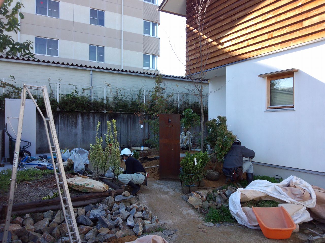 今回は雑木を主に使ったお庭づくりです。 建物脇には樹高4mのアカシデ。 その足元にはアセビやツツジ類を配植し、鉄板門柱の奥には実付の良いソヨゴを。 玄関通路を挟んだ奥には、素性の真っ直ぐなシャラと、奥への目線隠しにカクレミノ。 足元の地被類や花付の良い低木類をあしらってます。 後日、野芝を張って完成です。